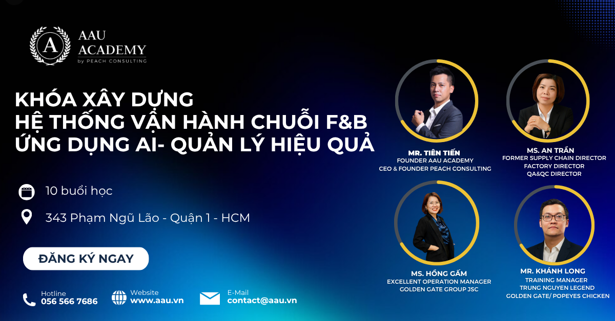 Khóa học đào tạo thực tiễn dành cho chủ kinh doanh chuỗi F&B đang chuẩn bị mở rộng hoặc tối ưu hóa hoạt động. Với 10 buổi học online/offline, khóa học hướng dẫn xây dựng hệ thống SOP chuẩn hóa, cải thiện quy trình vận hành để đạt hiệu suất xuất sắc, giảm lãng phí và tăng năng suất kinh doanh.